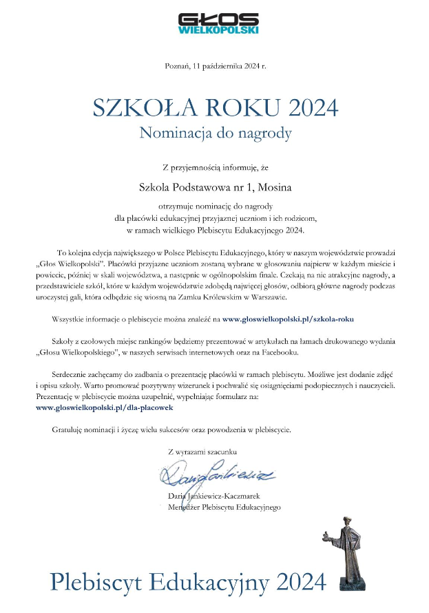 Dotarła do nas niezwykle miła wiadomość dotycząca nominacji do nagrody SZKOŁA ROKU 2024 dla placówki edukacyjnej przyjaznej uczniom i ich rodzicom. Konkurs jest elementem Plebiscytu Edukacyjnego organizowanego przez Głos Wielkopolski. Już sama nominacja to dla nas olbrzymie wyróżnienie, bowiem dowodzi, iż nasze działania są doceniane przez społeczność naszej placówki. Bardzo dziękujemy za okazane zaufanie i obiecujemy dokładać wszelkich starań, aby nie zawieść zaufania naszych uczniów i rodziców.