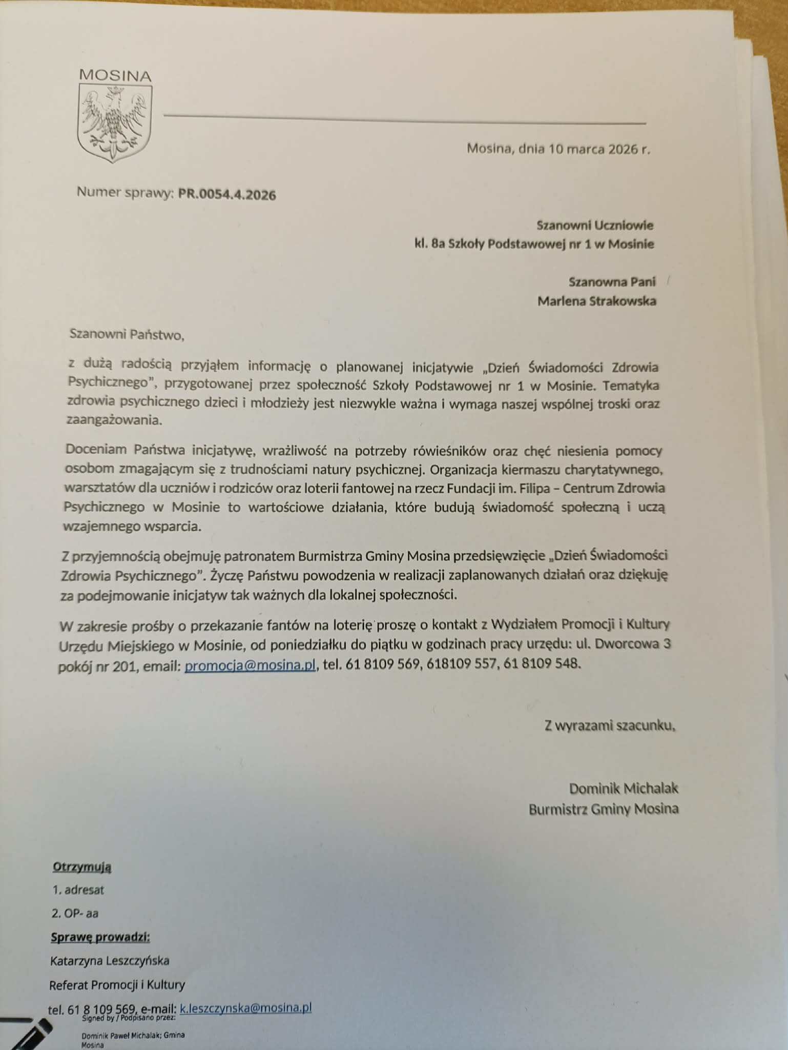 W środę 11 marca z inicjatywy uczniów klasy 8a, przy ogromnym wsparciu rodziców, nauczycieli, Dyrekcji szkoły oraz pod patronatem Burmistrza Gminy Mosina odbył się Dzień Świadomości Zdrowia Psychicznego. To uczniowie zauważyli ogromną potrzebę mówienia o zdrowiu psychicznym, widząc problemy, z jakimi borykają się rówieśnicy i bardzo chcieli wesprzeć jakąś organizację pomagającą młodym ludziom w kryzysie psychicznym. Okazało się, że taka instytucja znajduje się tuż za rogiem. W ramach tego wydarzenia podjęliśmy współpracę z Fundacją im. Filipa Centrum Wsparcia Psychicznego w Mosinie. Uczniowie klas 4-8 uczestniczyli w warsztatach dotyczących hejtu, prowadzonych przez przedstawicieli fundacji, a wszyscy uczniowie i pracownicy szkoły mogli wesprzeć tą inicjatywę zakupem rękodzieła naszych uczniów oraz słodkości. Udało się zebrać ponad 1748 zł, które zostaną przekazane Fundacji Filipa na pomoc psychologiczną potrzebującym dzieciom naszej szkoły. Serdecznie dziękujemy za wsparcie naszej akcji, która pokazała jak dużą sprawczość ma zaangażowana w działanie młodzież z pomocą rodziców, nauczycieli, Dyrekcji i władz miasta.