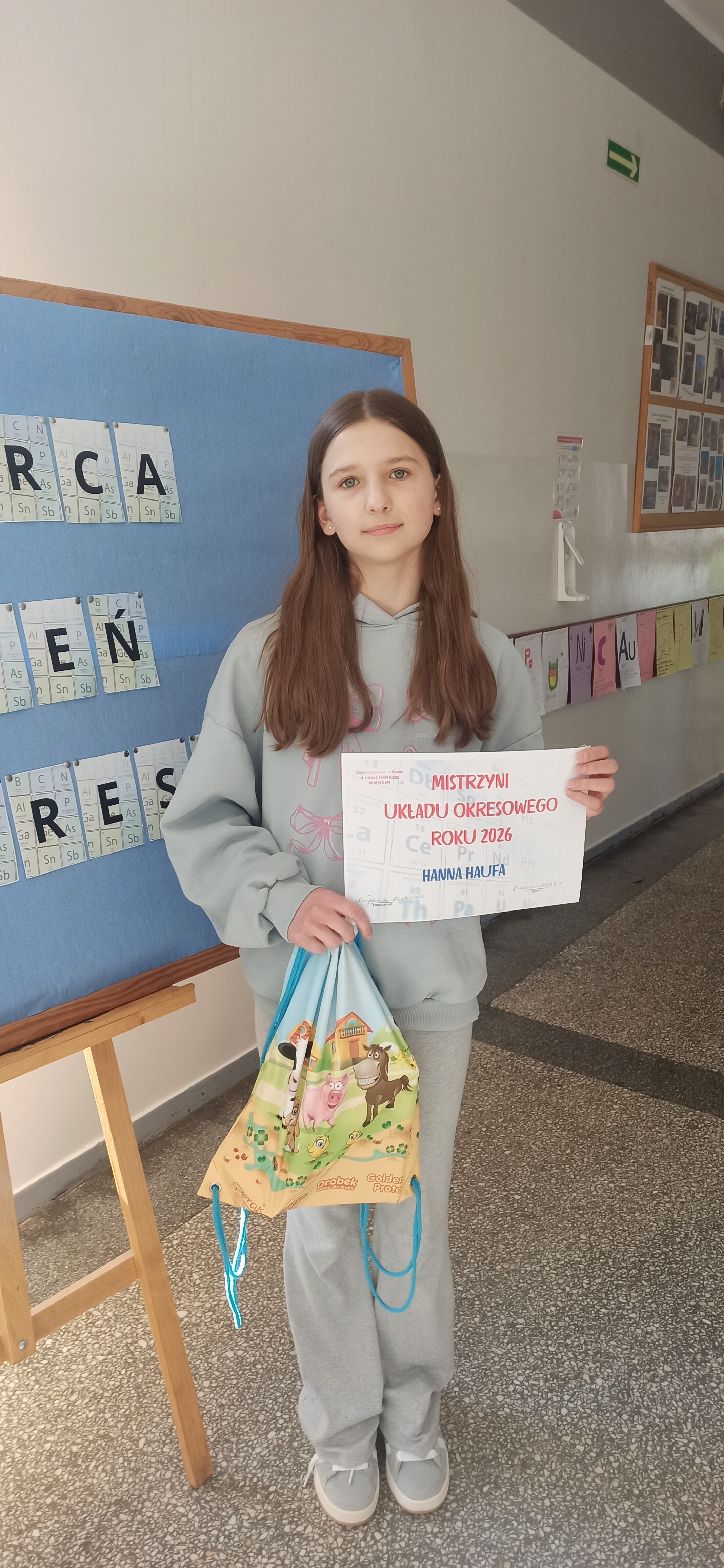 Kolejną atrakcją był konkurs „Mistrz Układu Okresowego”. W eliminacjach wzięli udział wszyscy uczniowie klas 7 i 8. Do finału zakwalifikowało się 11 uczniów. Po emocjonującej rywalizacji zwyciężczynią została Hanna Haufa, na drugim stopniu podium znalazła się Ewa Dengusiak, a na trzecim Zofia Kubiak. Wszystkie dziewczyny są uczennicami klasy 7a.
