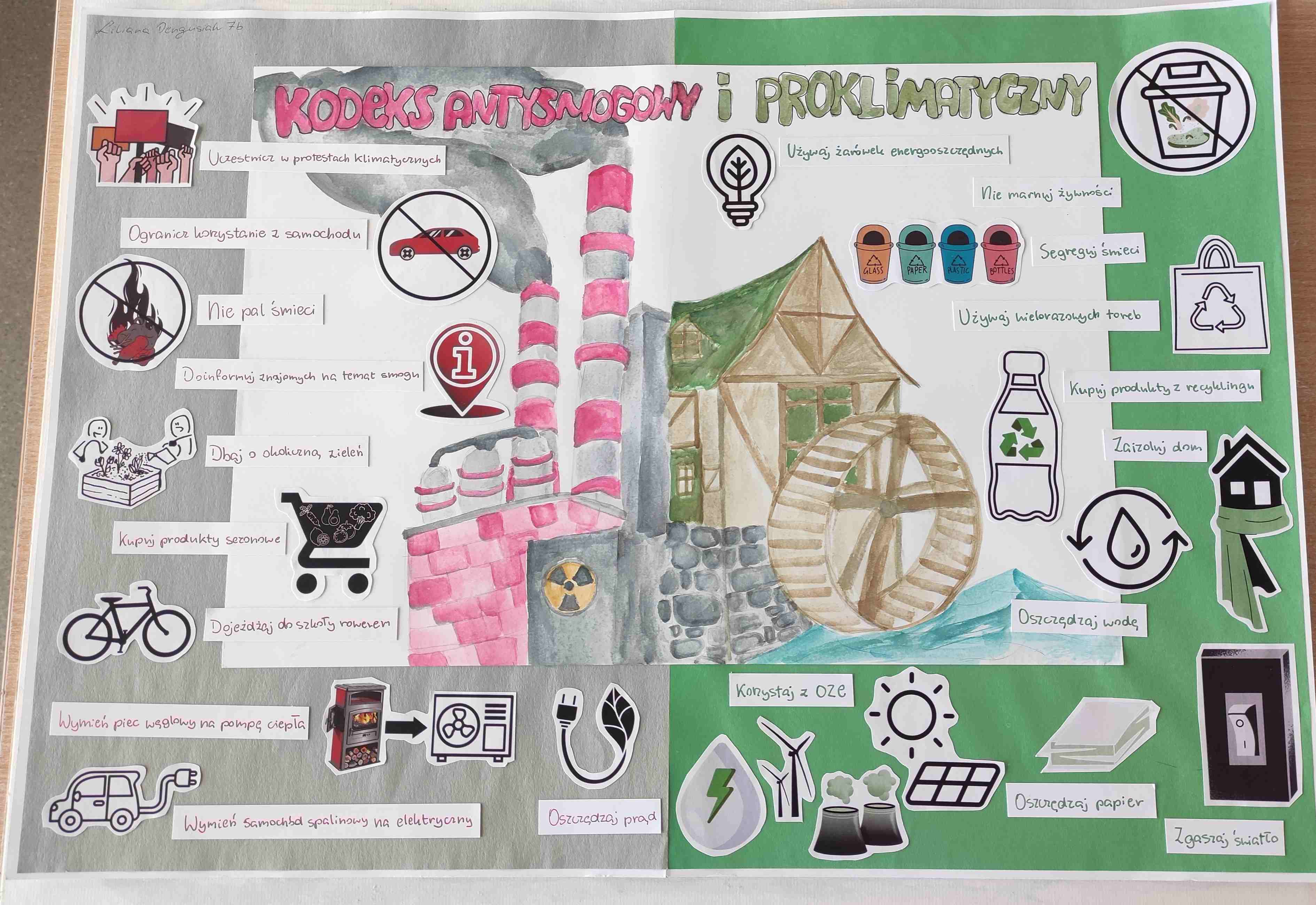 W związku z realizacją w naszej szkole projektu Aktywna Szkoła z klimatem i zdrową atmosferą, dla klas siódmych został ogłoszony konkurs pod tytułem Kodeks Antysmogowy i Proklimatyczny. Zadanie polegało na zaprezentowaniu 10 zasad na rzecz czystego powietrza oraz 10 przykładów dobrych praktyk dla klimatu i środowiska. Temat został przedstawiony w postaci pracy plastycznej wykonanej techniką kolażu.