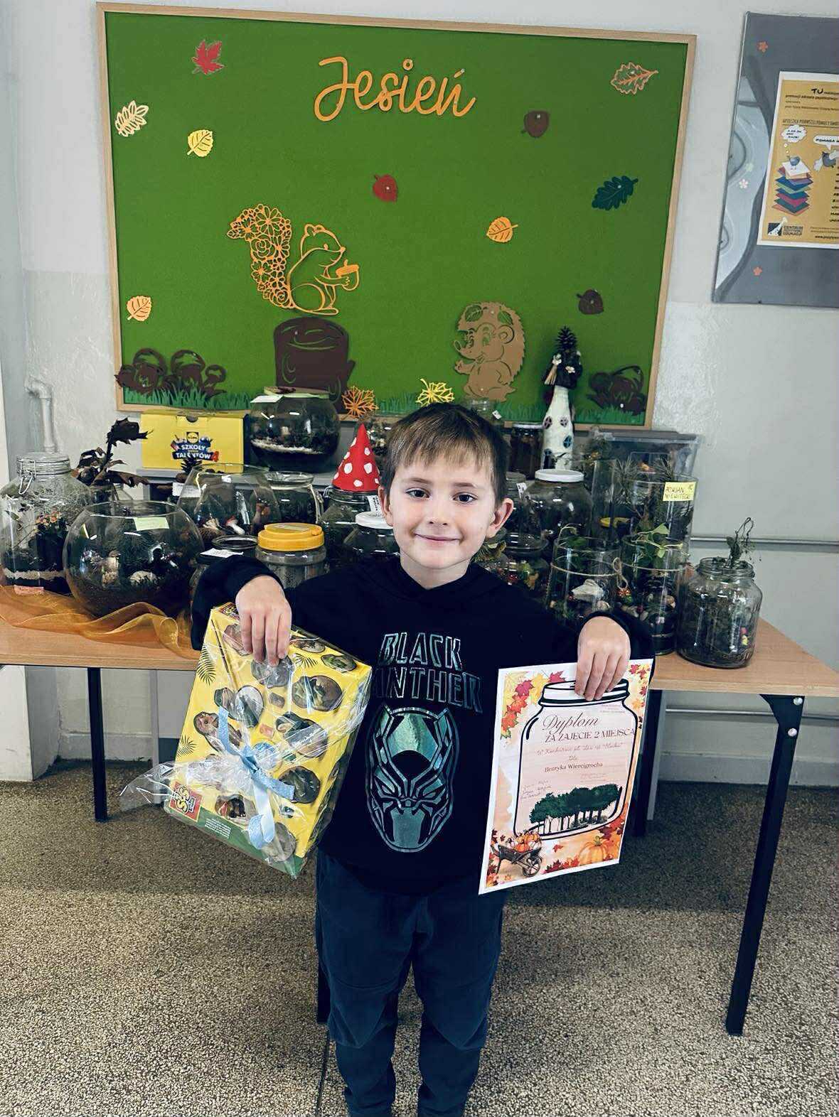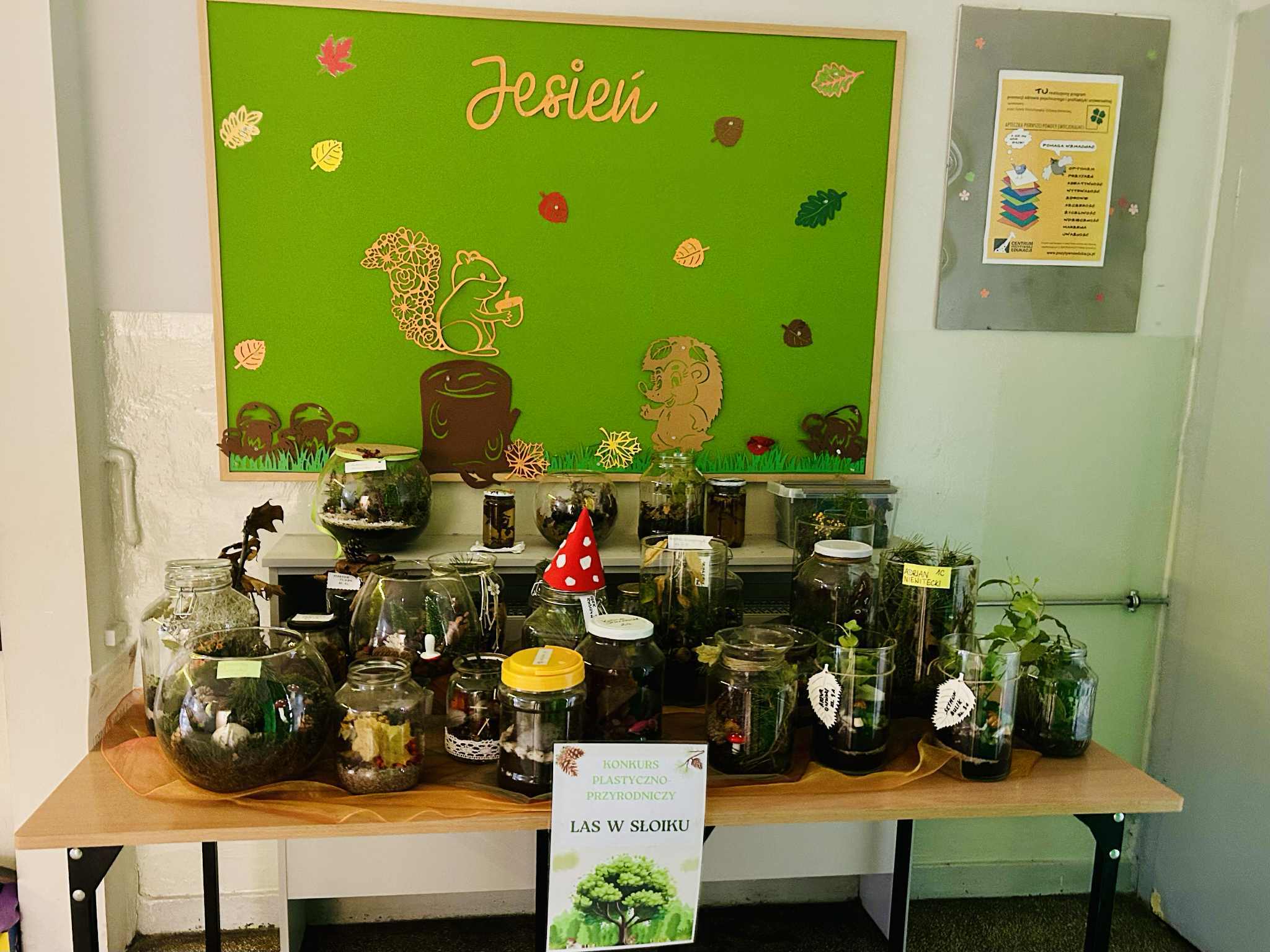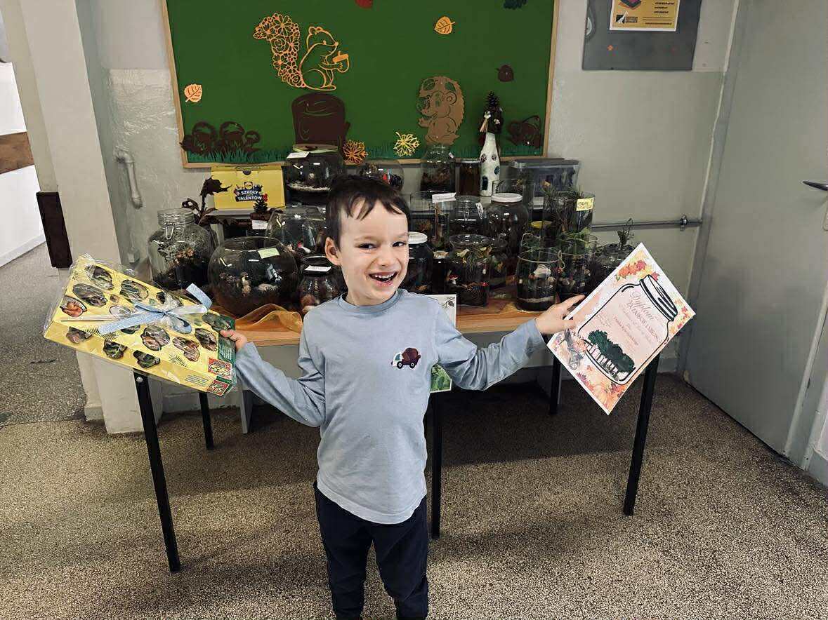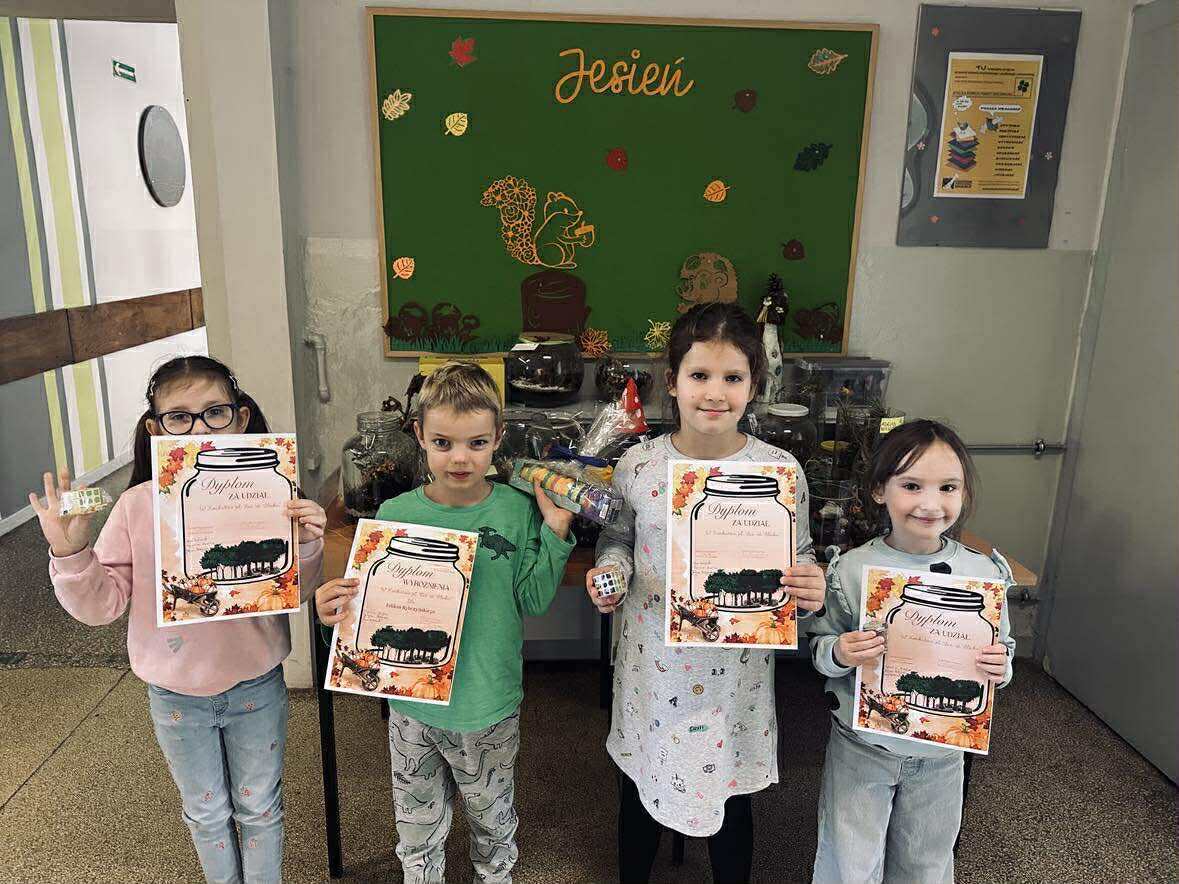 Tej jesieni w naszej szkole odbył się konkurs plastyczno-przyrodniczy pod hasłem „Las w słoiku”, skierowany do uczniów klas 0–3. Celem przedsięwzięcia było rozwijanie wrażliwości ekologicznej, kształtowanie postaw proekologicznych, a także inspirowanie dzieci do twórczego wyrażania swojego zachwytu nad naturą. Konkurs miał charakter interdyscyplinarny – łączył w sobie elementy przyrody, plastyki i techniki, a także rozwijał umiejętności z zakresu estetyki, kompozycji przestrzennej i obserwacji przyrodniczej. Uczniowie, tworząc swoje miniaturowe ekosystemy, wykazali się nie tylko zdolnościami manualnymi i artystycznymi, ale również wiedzą o środowisku naturalnym, jego równowadze i znaczeniu w życiu człowieka.