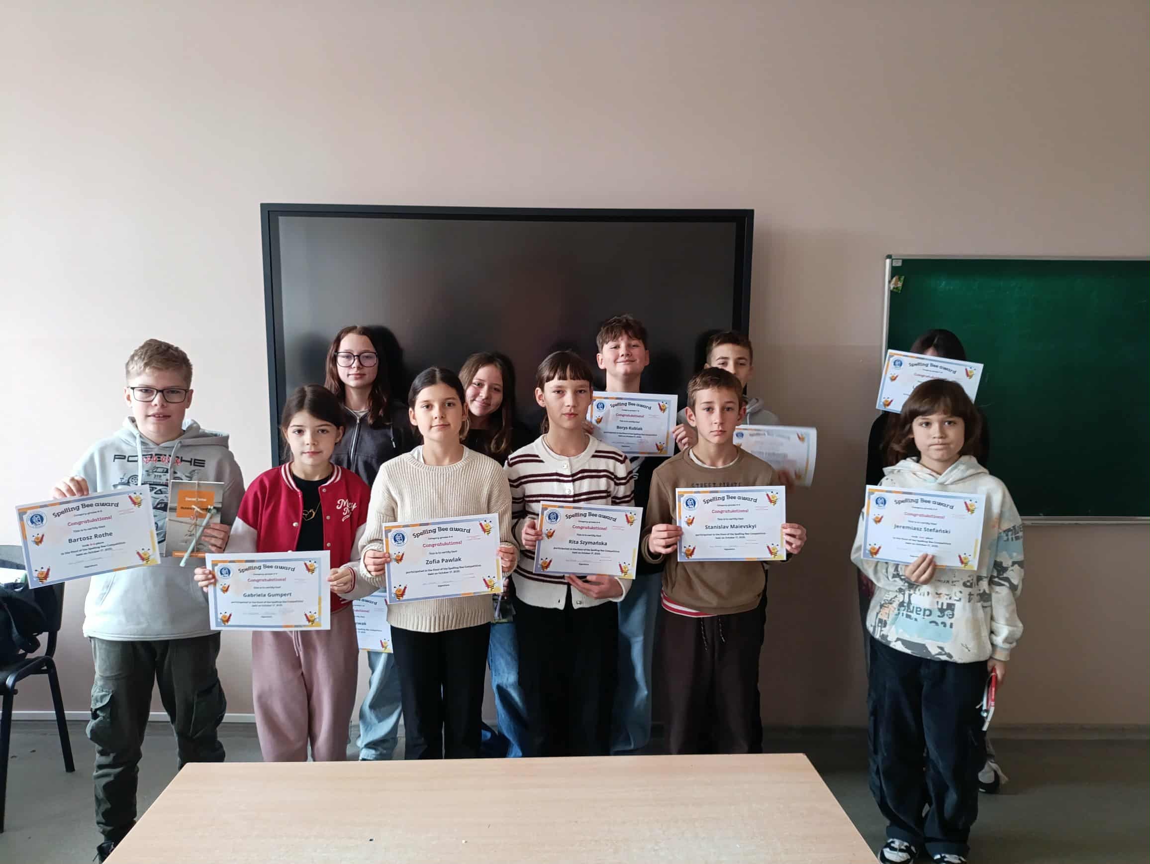 W piątek 17 października odbył się finał szkolnego konkursu Spelling Bee. Wcześniej w każdej z klas/ grup językowych wyłoniona została osoba, która najlepiej poradziła sobie z literowaniem (rekordziści doszli do literowania 14- literowych słów!). Uczniowie mierzyli się w 4 konkurencjach: zapisanie podanych przez nauczyciela liter, zapisanie literowanych wyrazów, przeliterowanie zapisanych słów oraz przeliterowanie tylko usłyszanych wyrazów. Reprezentanci klas/ grup rywalizowali w dwóch kategoriach wiekowych (IV-VI oraz VII-VII).