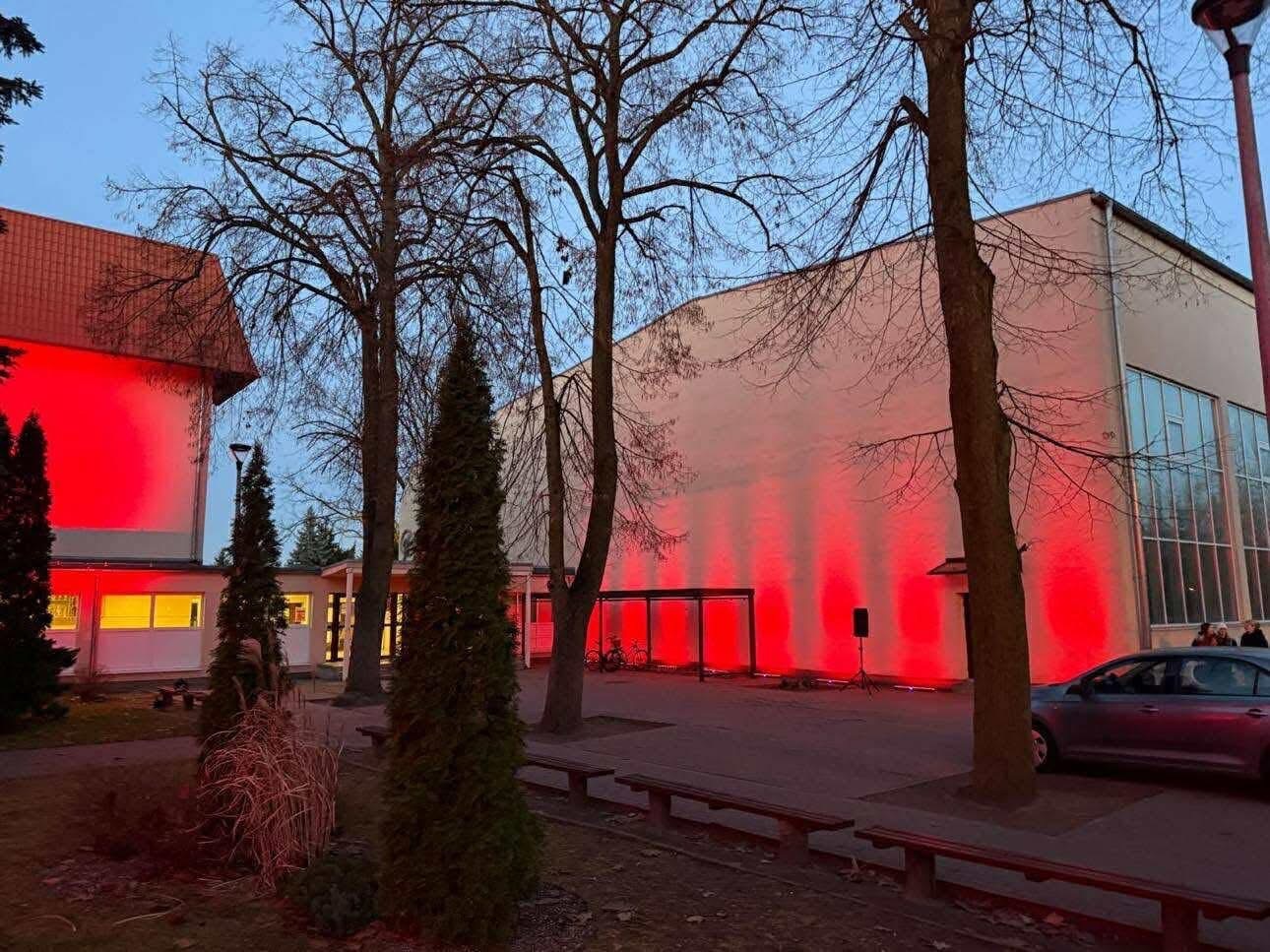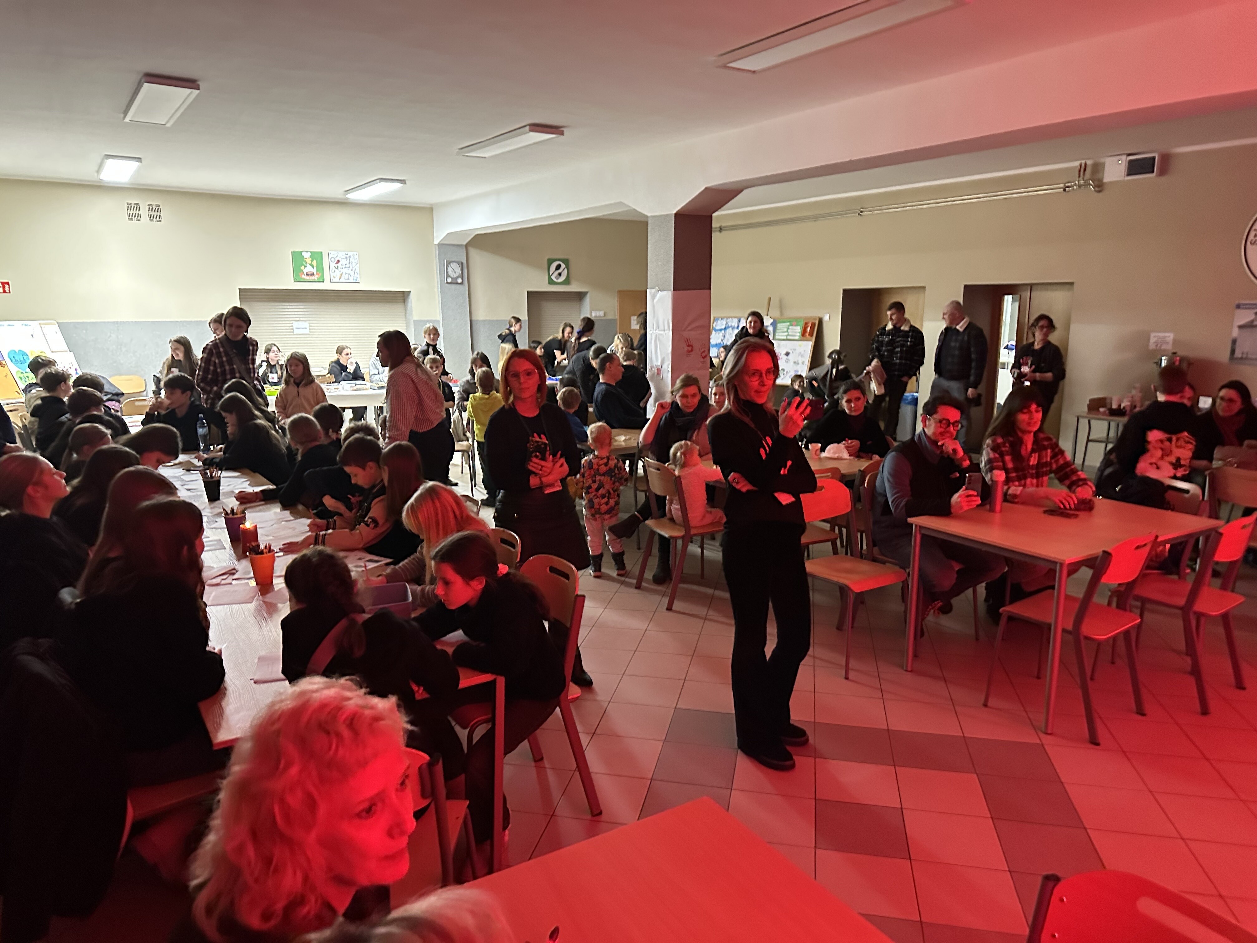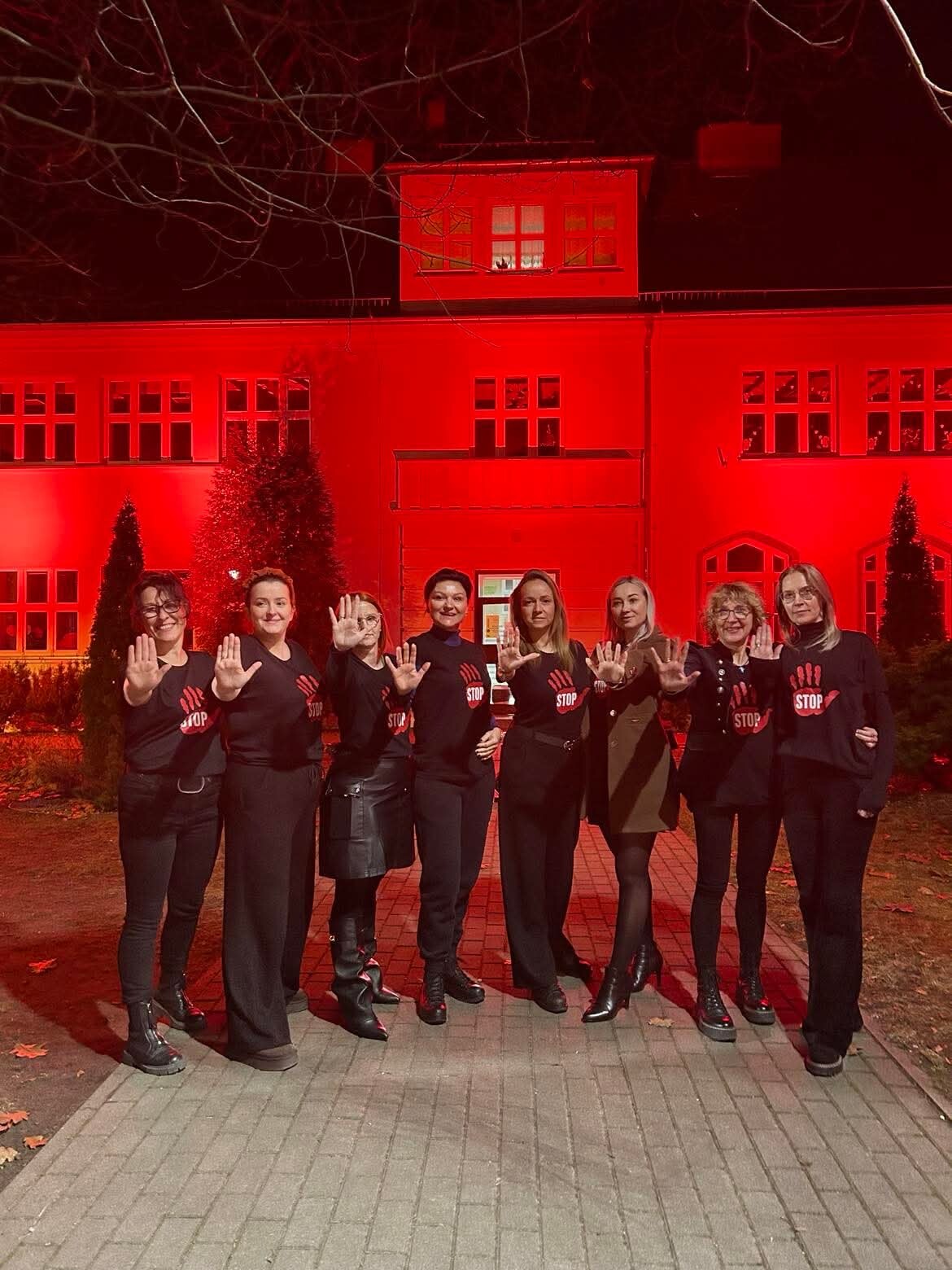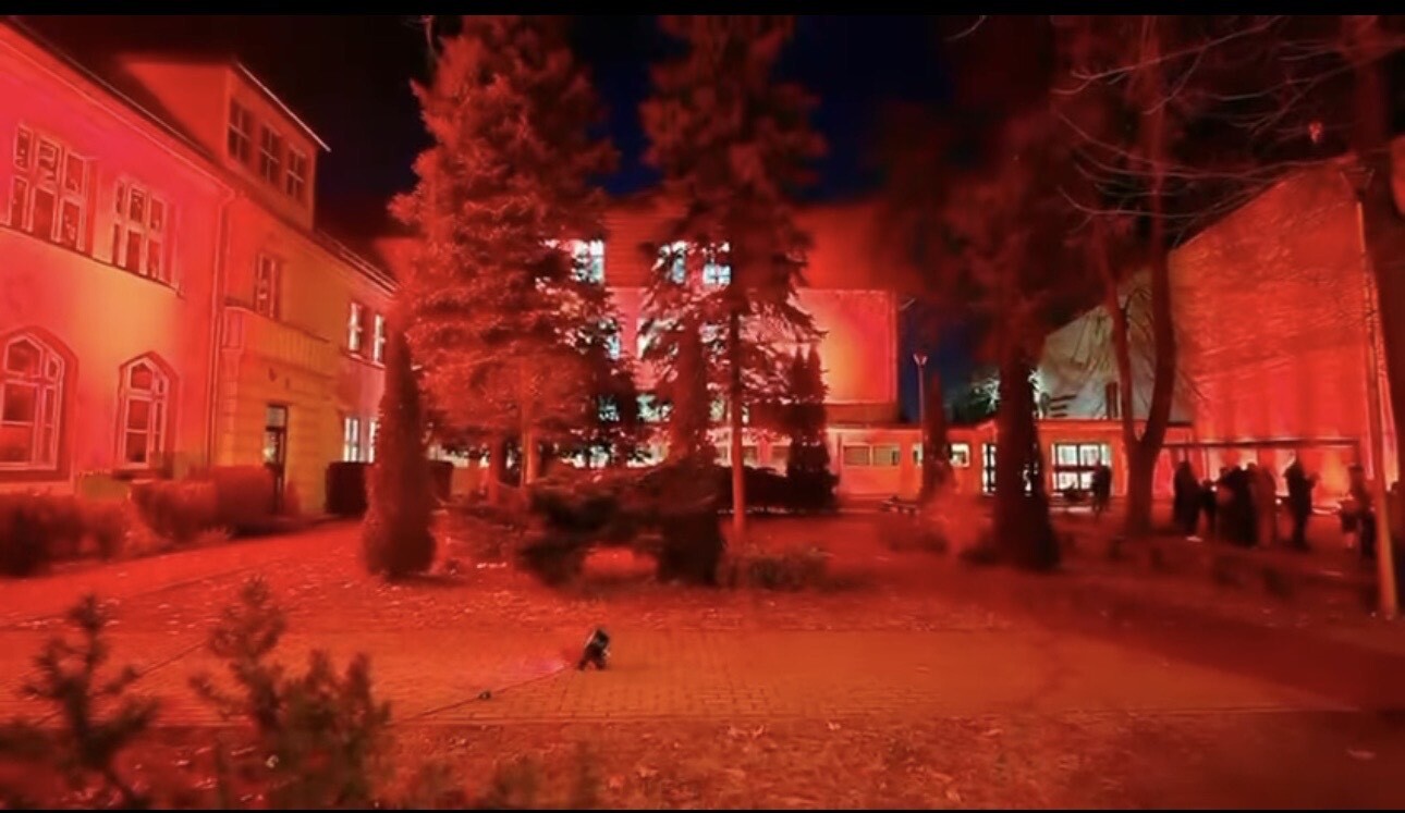 Tego wieczoru budynek szkoły rozbłysnął intensywnym czerwonym światłem, symbolem sprzeciwu wobec przemocy i jednocześnie przypomnieniem, że każdy z nas ma wpływ na bezpieczeństwo drugiego człowieka. W atmosferze skupienia, ale i wzruszenia, na scenie wystąpili uczniowie, wykonując poruszające utwory „Moja i twoja nadzieja” oraz „Tolerancja”. Ich głosy, pełne młodzieńczej szczerości, jeszcze mocniej podkreśliły przesłanie tego dnia — że nadzieja i wzajemny szacunek mogą stać się fundamentem lepszego świata.