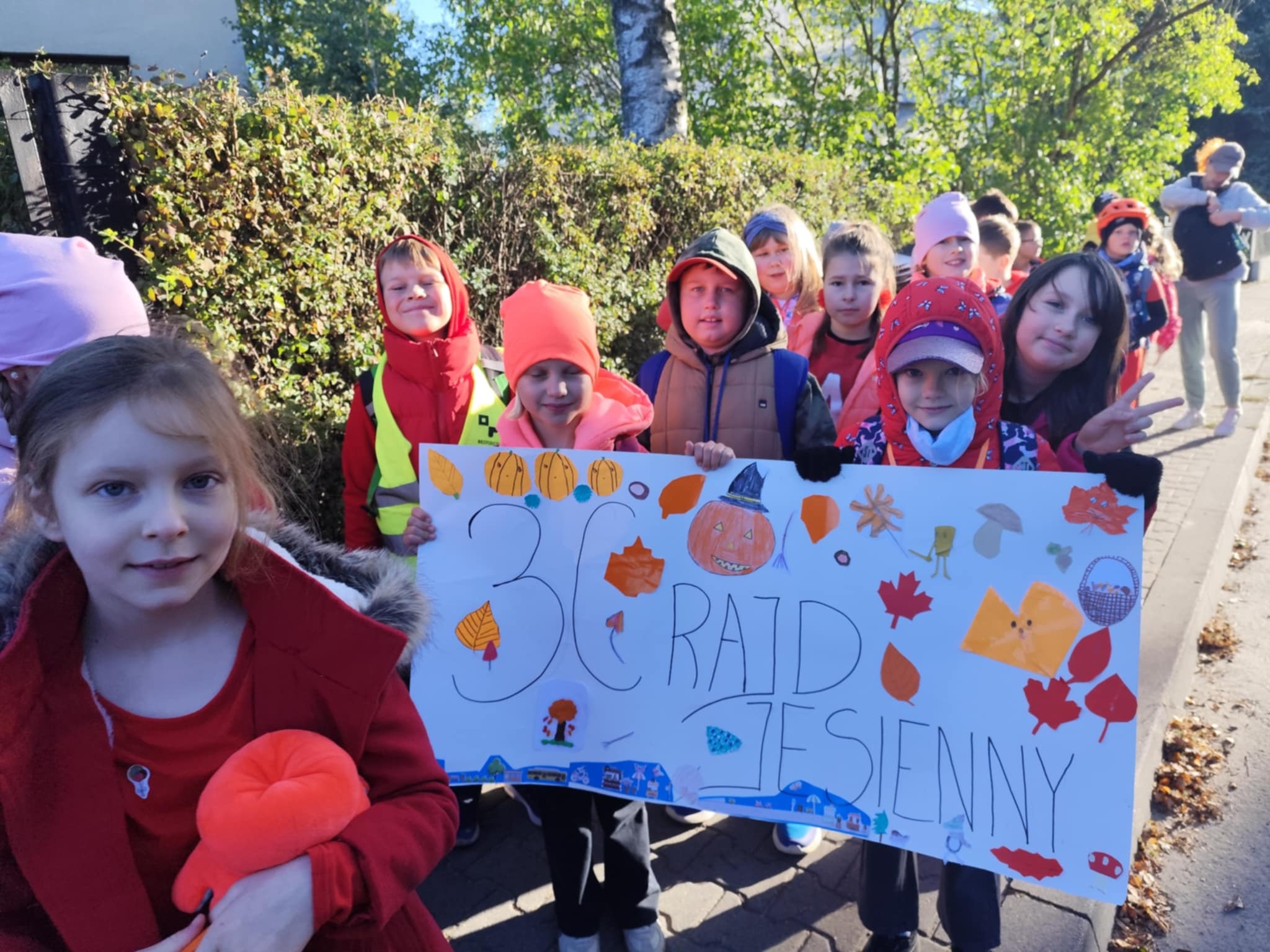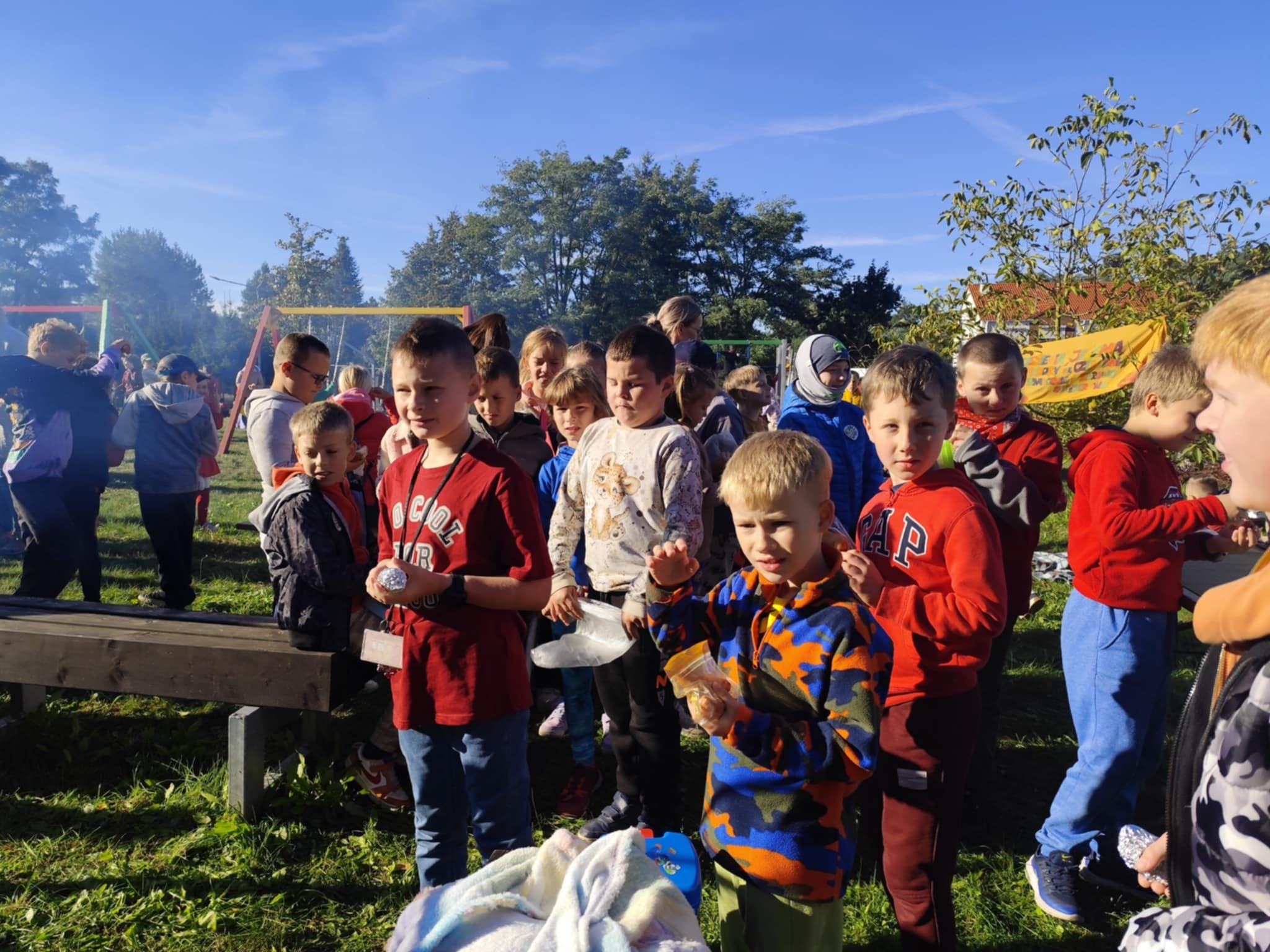 Uczniowie klas 1–3 wybrali się na jesienny rajd, podczas którego świetnie się bawili. Wspólne ognisko, pieczenie kiełbasek, wesołe zabawy i rozmowy sprawiły, że ten dzień na długo pozostanie w pamięci. Radość, śmiech i jesienna atmosfera towarzyszyły nam od początku do końca. Podczas gdy starsze dzieci maszerowały i bawiły się w plenerze, najmłodsi odkrywali uroki jesieni w nieco inny sposób. Wesołym krokiem, z piosenką na ustach, przeszliśmy przez rynek w poszukiwaniu jesiennych darów. Po powrocie do szkoły czekała nas prawdziwa jesienna przygoda – tańce, malowanie pejzażu palcami i tworzenie barwnych prac plastycznych.