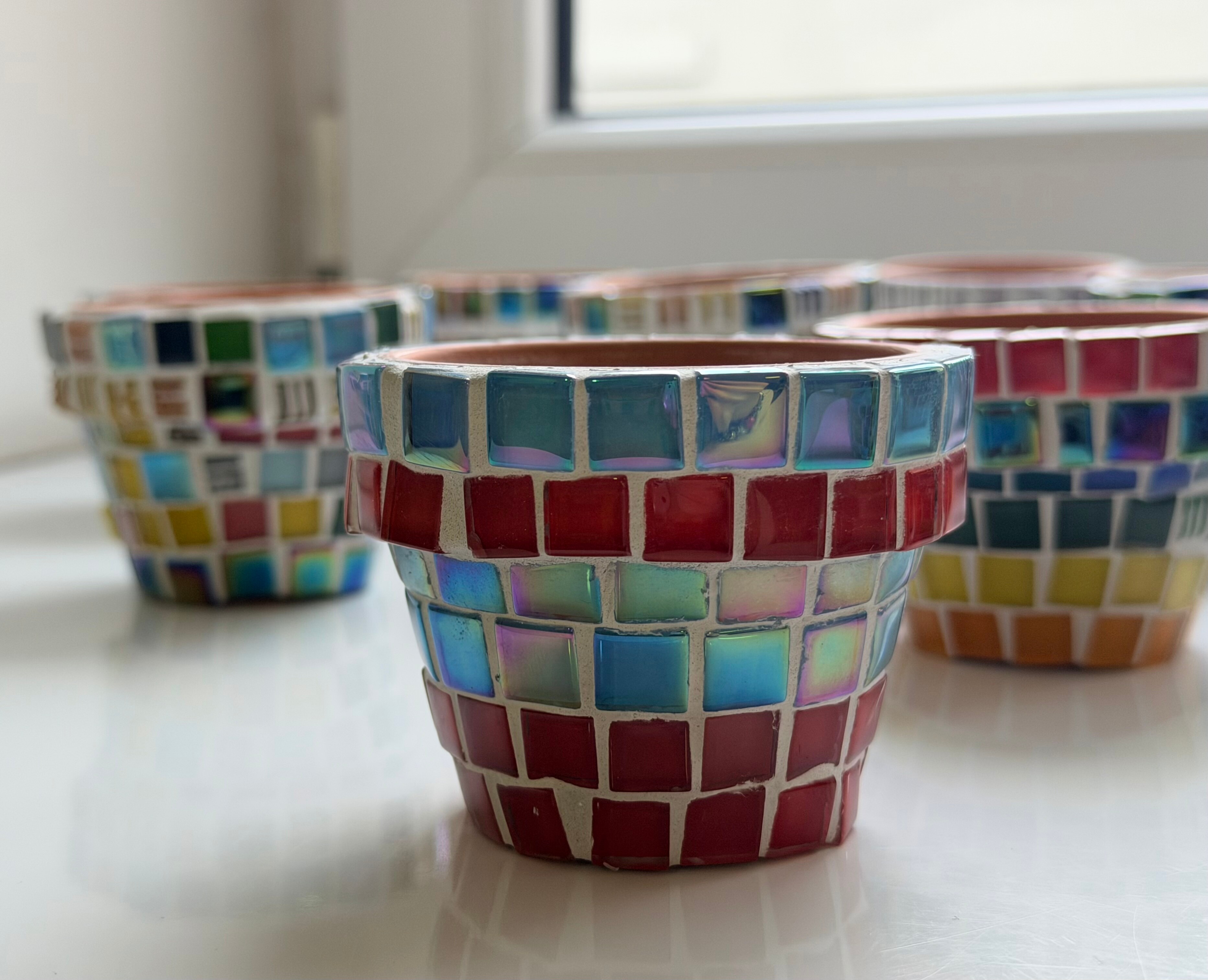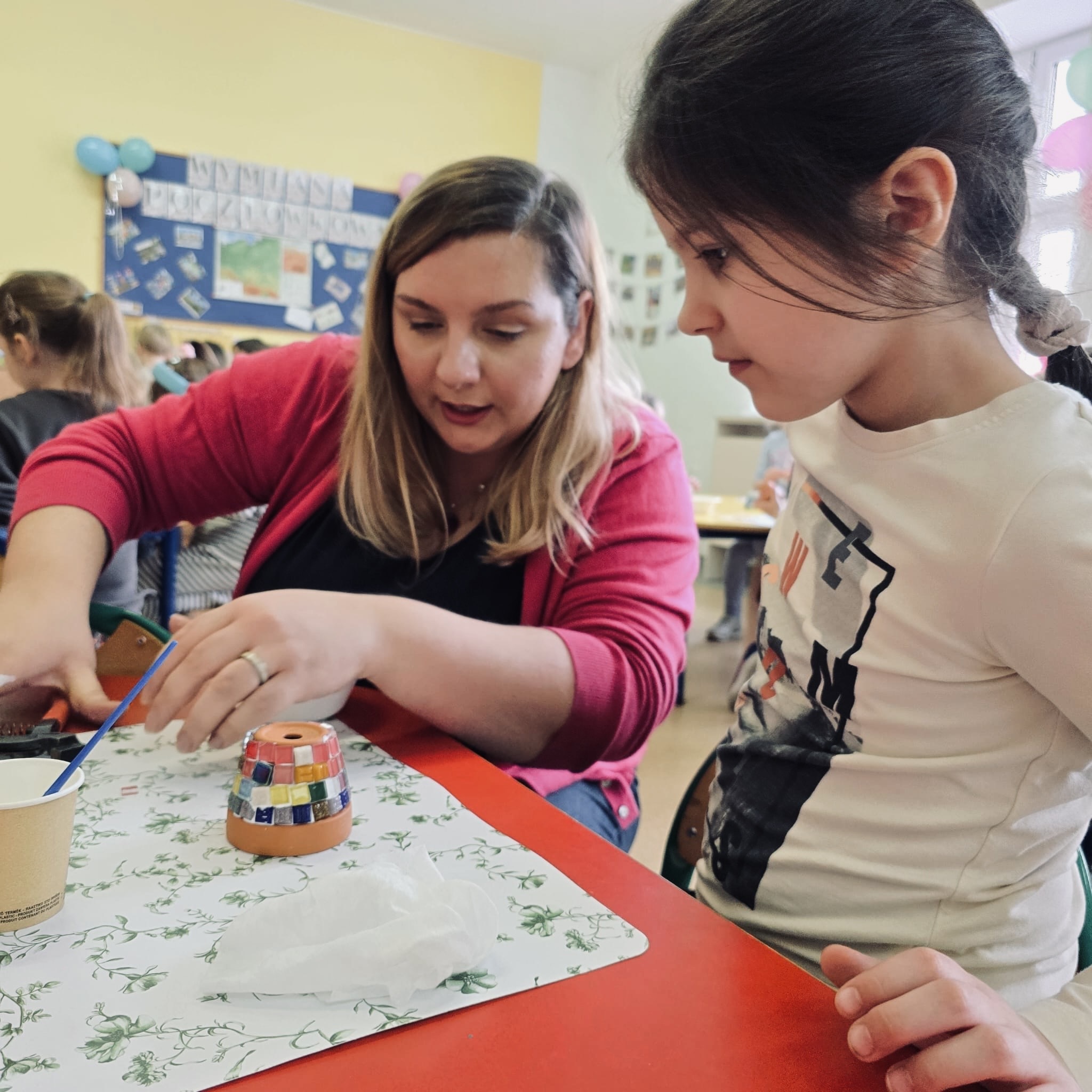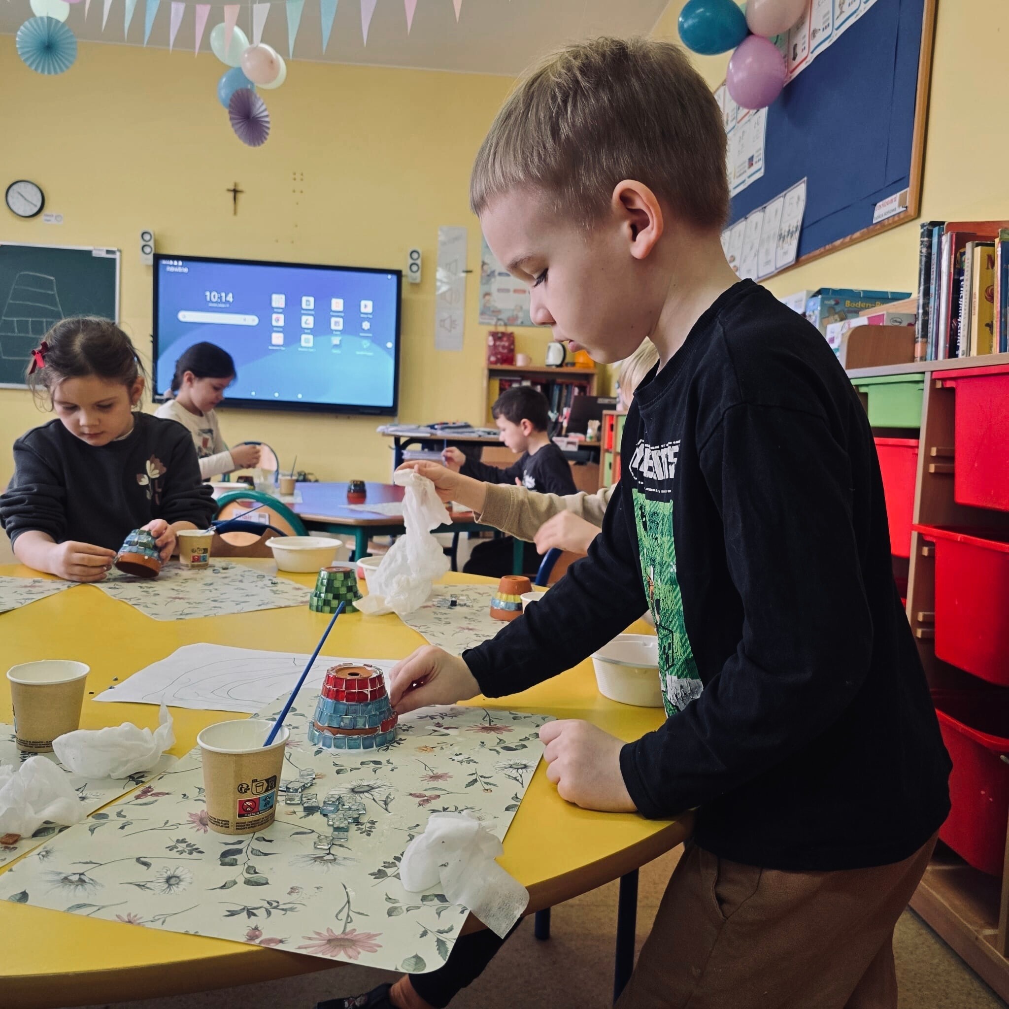 Tuż przed feriami uczniowie klasy 0a wzięli udział w warsztatach mozaiki, które poprowadzili pani Natalia i pan Zbyszek z firmy Tesspira. Podczas zajęć dzieci samodzielnie tworzyły kolorowe doniczki, ucząc się cierpliwego układania drobnych elementów oraz dokładności w działaniu.