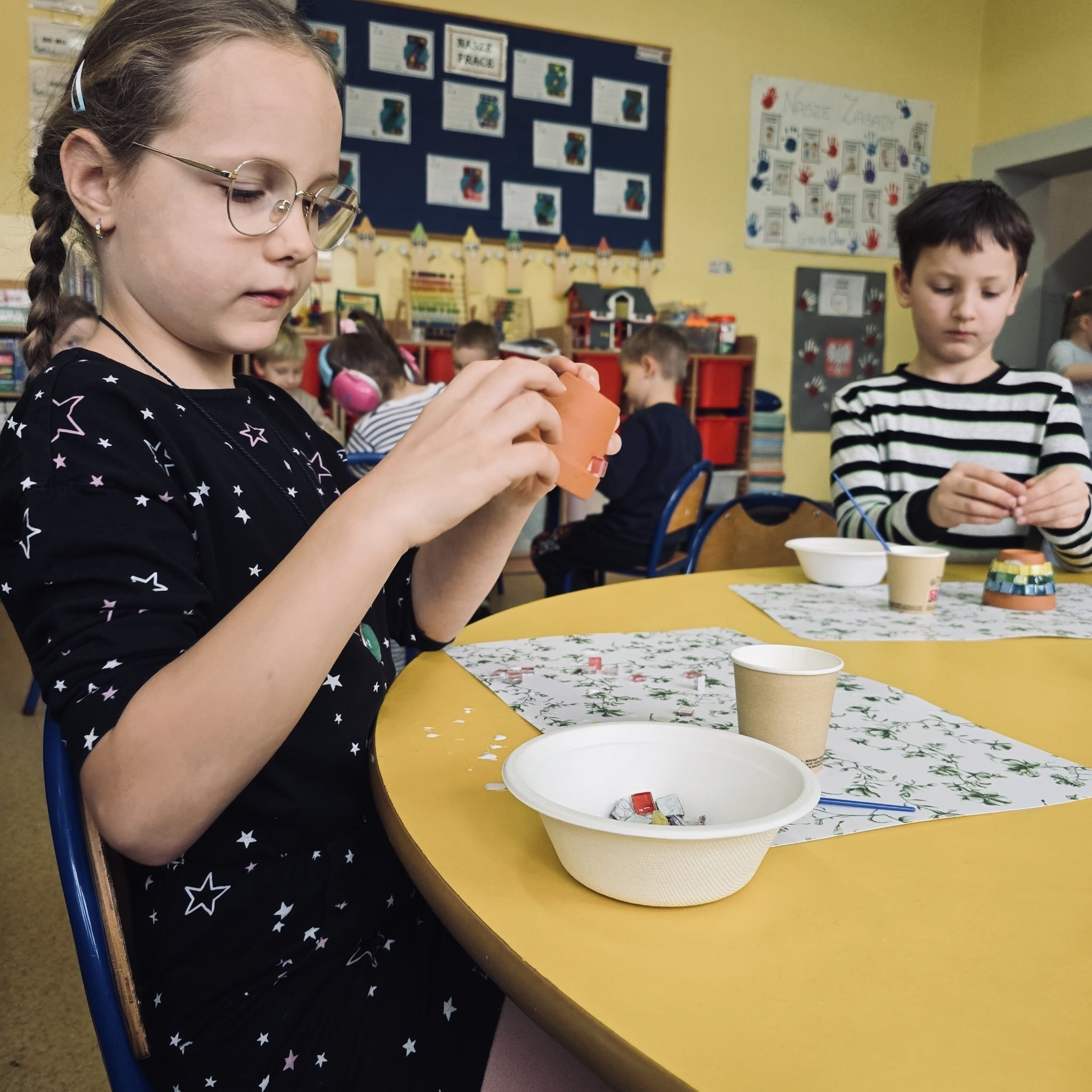 Po zakończeniu zajęć doniczki zostały zafugowane i dokładnie wyczyszczone, a następnie wróciły do szkoły, gdzie czekają na swoich autorów. Po feriach dzieci wykorzystają je podczas kolejnych zajęć przyrodniczych. W doniczkach zostaną posadzone cebulki kwiatów, a uczniowie będą prowadzić obserwacje wzrostu roślin oraz poznawać ich budowę.