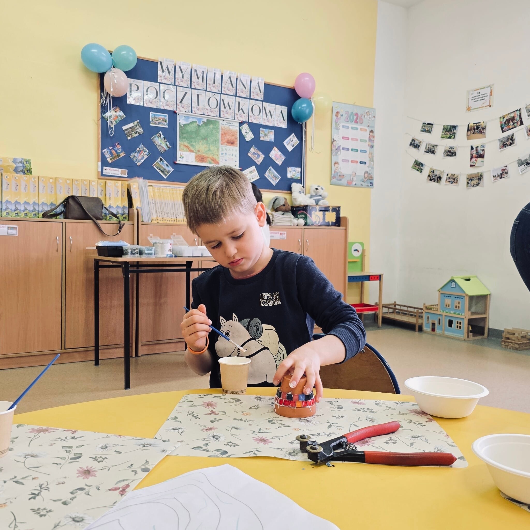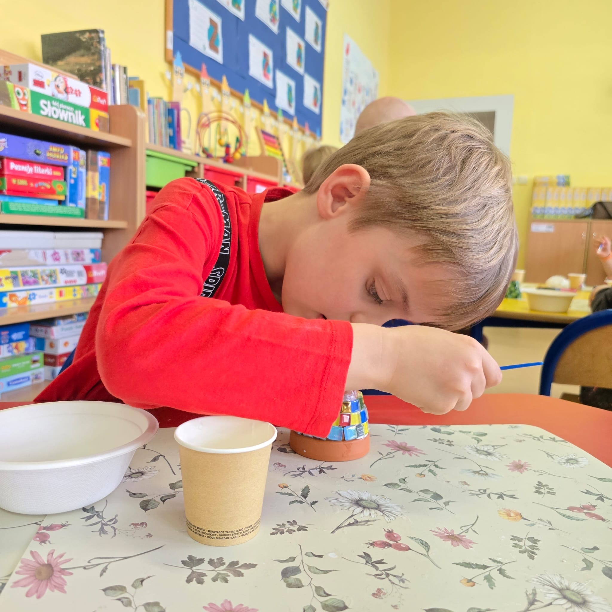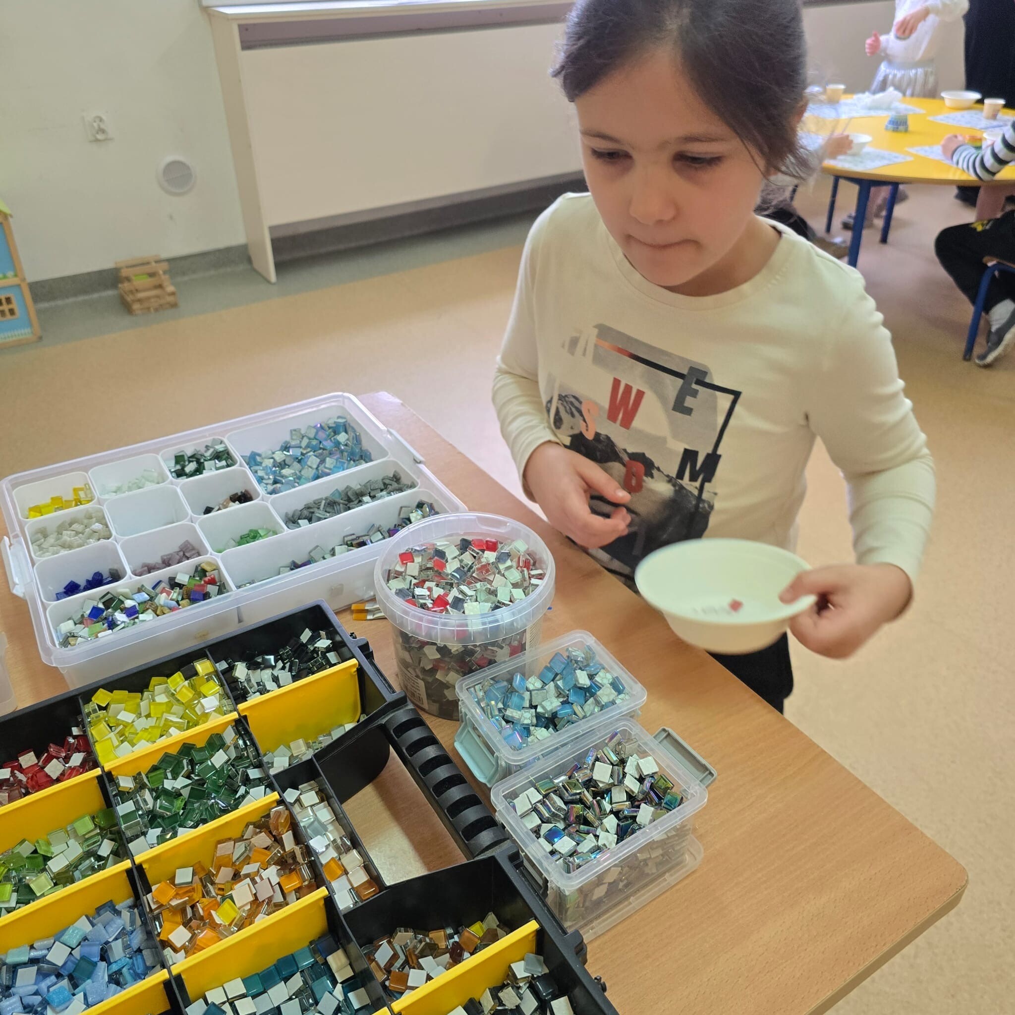 Warsztaty były nie tylko twórczą zabawą, ale również ważnym ćwiczeniem wspierającym rozwój motoryki małej. Układanie mozaiki sprzyja rozwijaniu uważności, koncentracji oraz koordynacji wzrokowo-ruchowej.